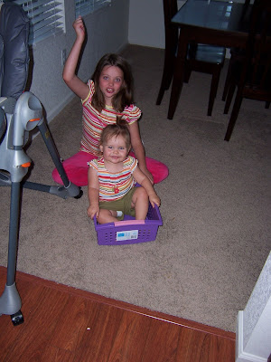 The girls playing train. Karlee was pushing Izabella around saying, "Chugga-chugga, chugga-chugga." and Izabella yelling, "Choo! Choo!".